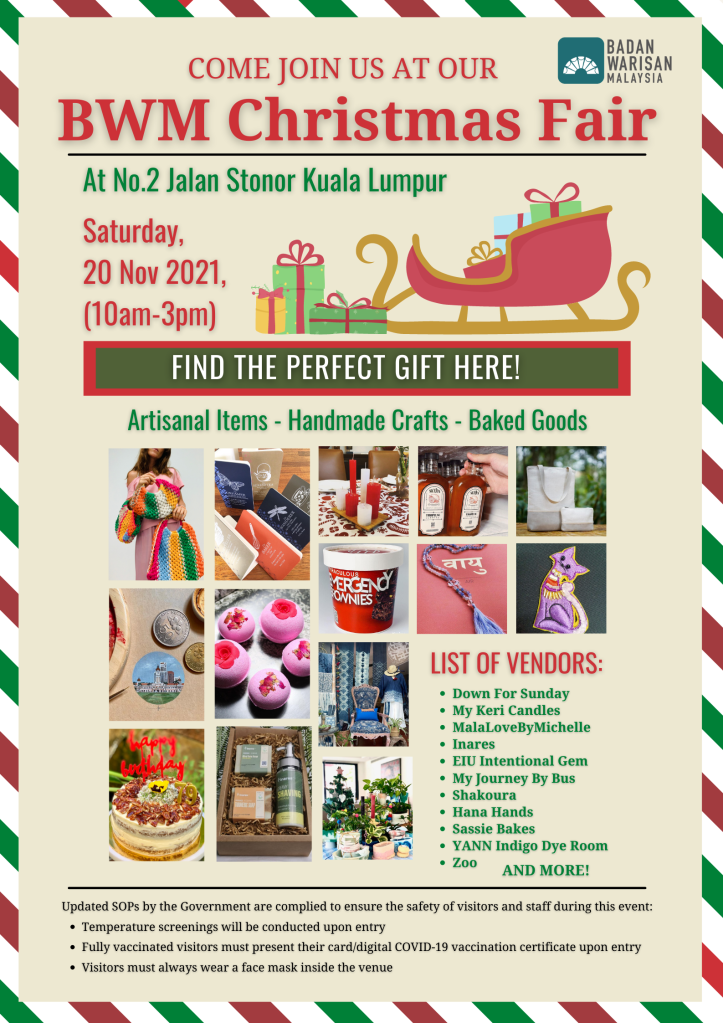 Please come visit our Heritage Centre at No. 2 Jalan Stonor, Kuala Lumpur on Saturday, 20 November 2021. We are pleased to announce that we are organising a Christmas Fair on that day from 10.00 am – 3.00 pm. There will be a variety of lovely merchandise and hand-crafted items from local artisans for sale during the fair! SOPs will be observed.